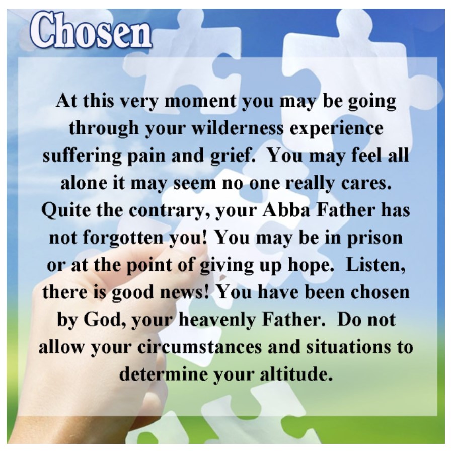 Image Posted on July 22, 2022 in Quotes From The Secret Place CHOSEN Share this: Share on X (Opens in new window) X Share on Facebook (Opens in new window) Facebook Like Loading... Related